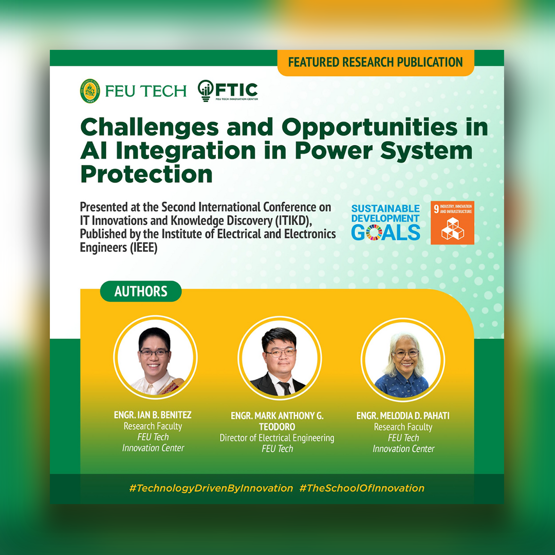 CONGRATULATIONS to our dedicated FEU Tech associates, Engr. Mark Anthony Teodoro (Program Director for Electrical Engineering), Engr. Ian Benitez (Research Faculty), and Engr. Melodia Pahati (Research Faculty) who have just published two groundbreaking research papers that showcase the transformative power of Artificial Intelligence (AI) in modernizing power systems. As the energy sector faces increasing demands for reliability and efficiency, AI is proving to be a game-changer in enhancing protection and operational strategies.