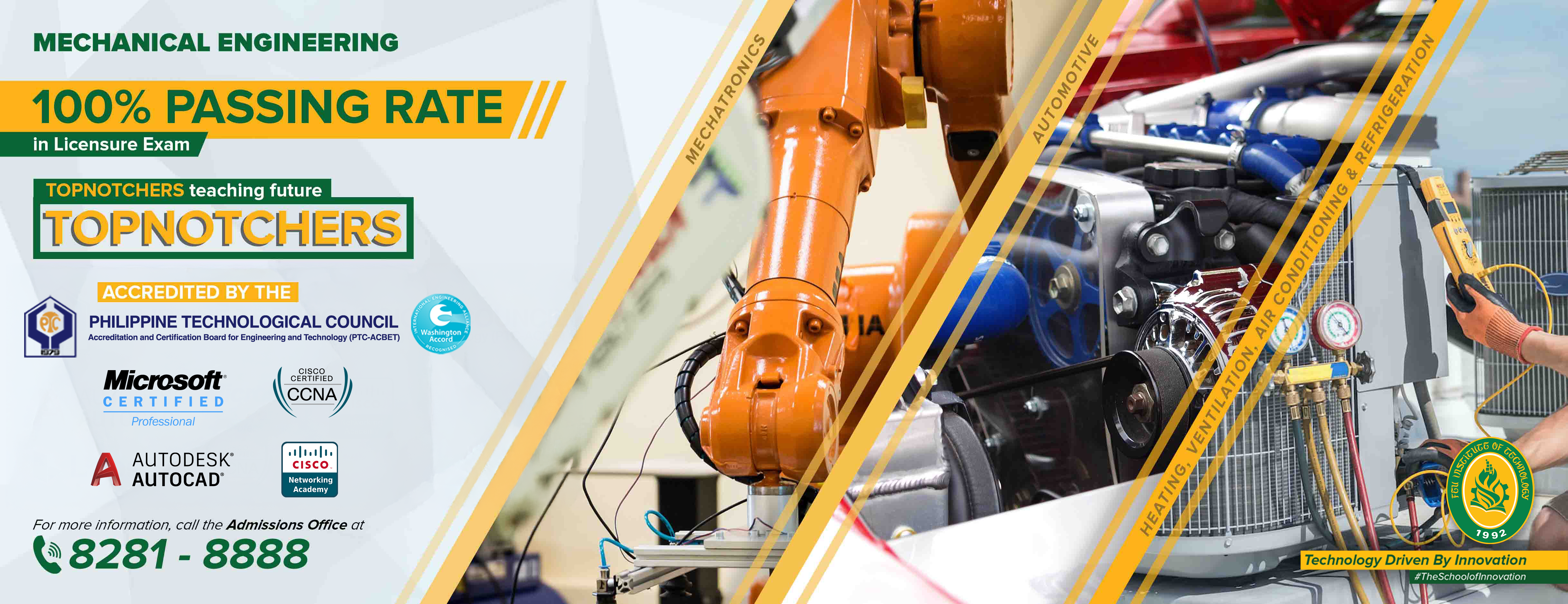 The field of mechanical engineering covers two broad areas: the thermal system and the mechanical system. The traditional courses in mechanical engineering that include power plant engineering, industrial plant engineering and machine design are supplemented by new and emerging fields such as renewable energy systems, mechatronics, control system and computer applications. The Bachelor of Science in Mechanical Engineering program has the following distinctive features: elective courses in the new and emerging technologies; industry immersion or on-the-job training; research project; and a culminating design project. The program also offers new courses such as technopreneurship, design thinking and bio-engineering.
