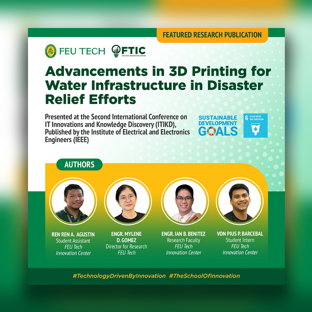 Authored by Engr. Mylene Gomez (Director for Research), Engr. Ian Benitez (Research Faculty), and students Ren Ren Agustin and Von Pius Barcebal, the paper titled “Advancements in 3D Printing for Water Infrastructure in Disaster Relief Efforts” showcases how cutting-edge 3D printing technology can revolutionize water infrastructure during emergency response situations.